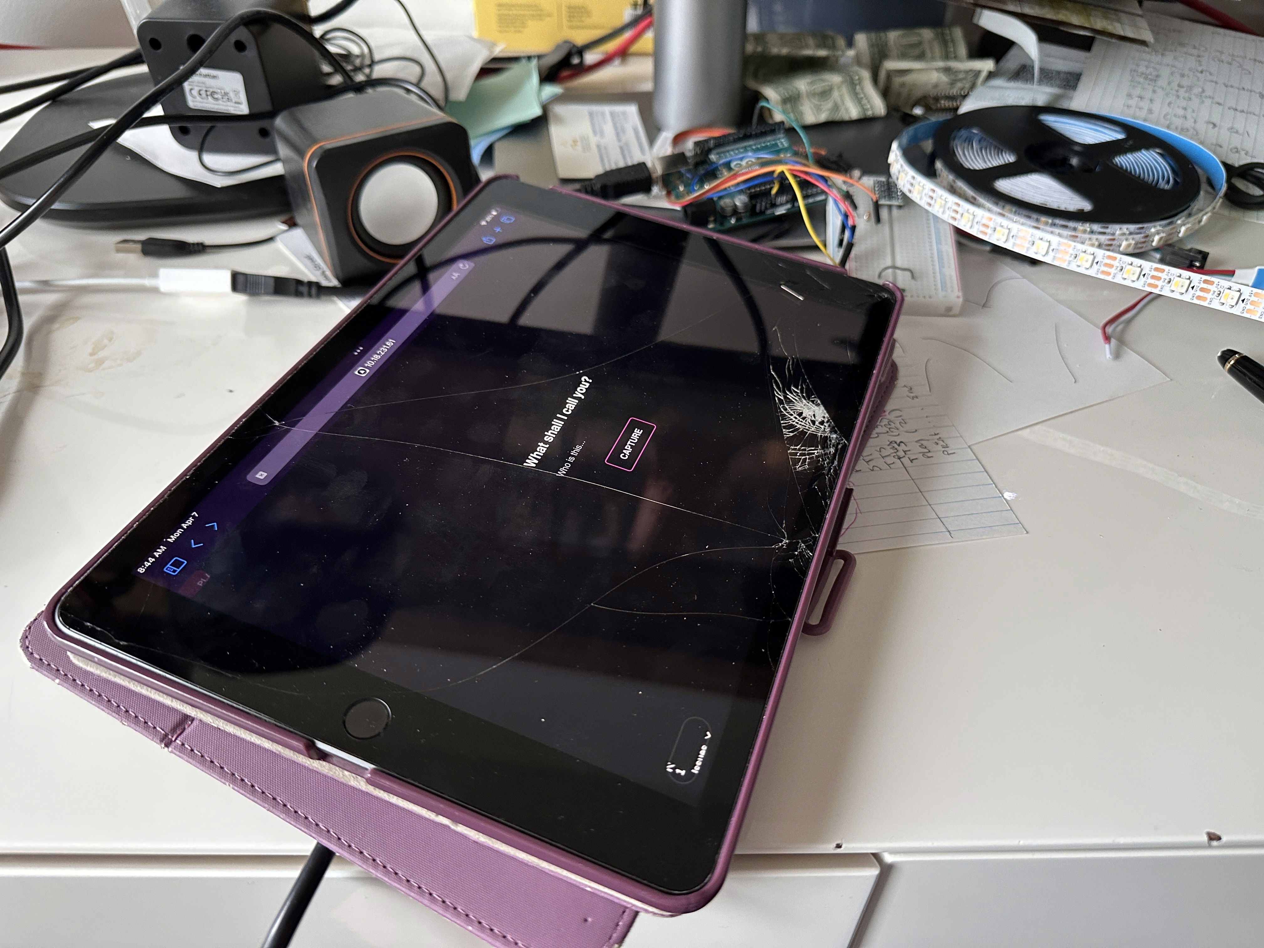 Production design started with the storied world, what may have happened in this moment of the fictional universe, and a broken iPad. I knew the participants would be using an iPad to interact with and having it cracked gave a feeling of disruption.