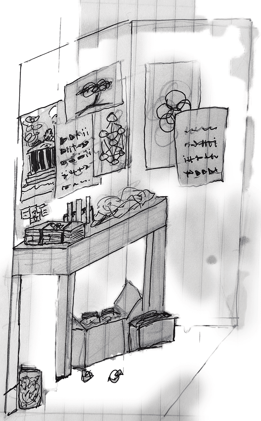 Books that the Professor was using to solve the connection to the beings from the unknown. ![]() | A special relic of notes that the professor would have kept. A borrowed item from a previous production with a similar tone. ![]() | Desk is coming together. Books, bottles, and other methods of research to fill the world. ![]() |