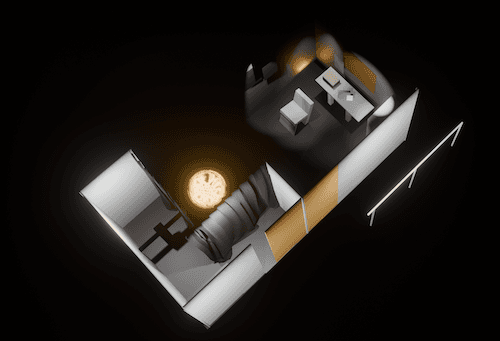 Finished the production of the room so user testing could start. Lots of elements are at play to get the tone aligned with the story. Production design was an excellent place to meet "in the middle" with a creative writing team. The set is practical but needs to convey story without saying anything. Story, tone and theme guided the choices I made and the placement of objects and furniture.