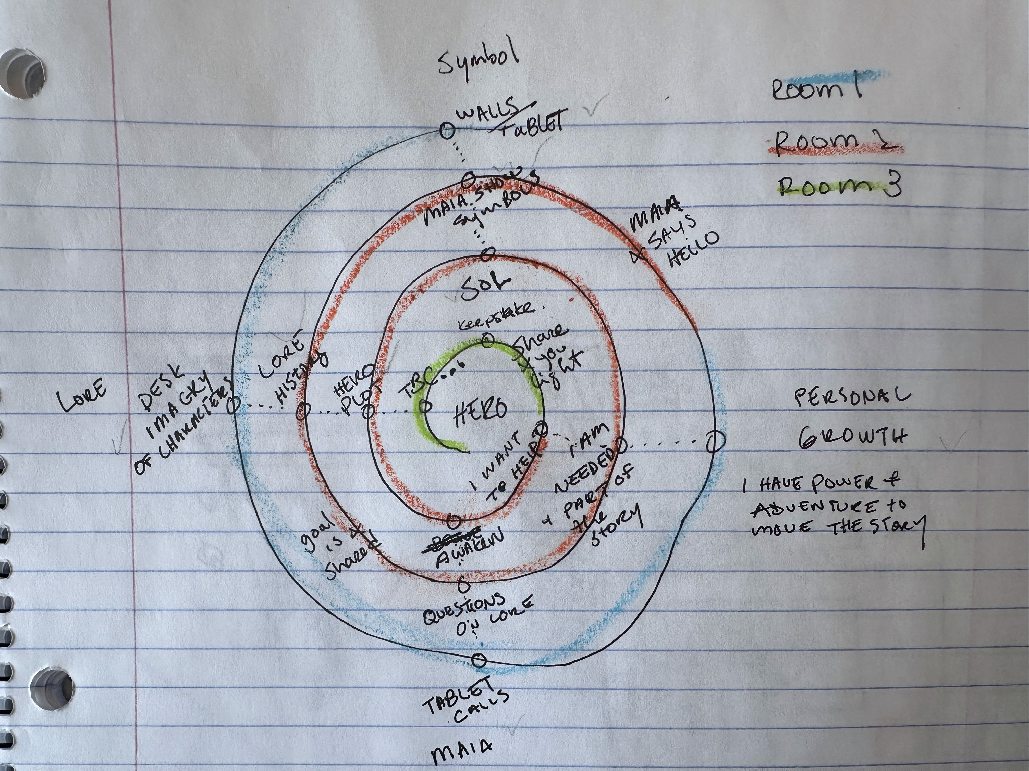 This week, I am bringing story and technology together. My main goal in bringing my MAIA experience to life is to incorporate nonlinear storytelling, inspired by Jane Alison’s SPIRAL format, paired with guidance from Imagineer Margaret Kerrison book Immersive Storytelling: A Writer's Guide.